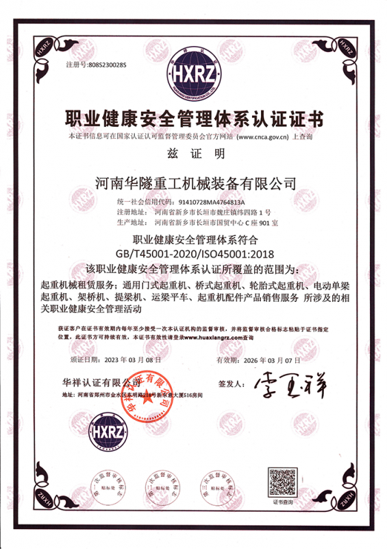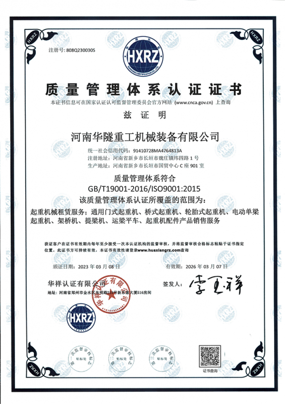 河南華隧重工機械裝備有限公司主要從事通用門式起重機、橋式起重機、電動單梁起重機,輪胎式起重機、架橋機、提梁機、遠梁平車、鋼絲繩電動萌蘆、卷揚機、起重配件制造、銷售:起重機械租賃、安裝和維修,起重設備園收,機械設備維修,鋼結構工程承包,橋梁工程及技術咨淘服務,銷售五金制品、機電設備:建設工程監理,建設工程設計,各類工程建設活動,建筑勞務分包,建筑物折除作業,施工作業,工程管理服務,土石方工程施工,裝如發運?! 」疽淹ㄟ^IS0國際質量、環境、健康與安全三合一標準認證,特種設備制造許可證和特種設備安裝改造維修許可證。擁有完熟的質量管理體系。嚴格的管理制度,強大的生產能力和先進的檢測手段,在保證產品質量的同時,也具備了極強的市場競爭力。  公司堅持科技創新為理念,產品質量為核心,注重信譽,建立了減信可靠、快捷、思速。便利周到的售后服務網絡?! ∥覀儞碛械募夹g專家和技術服務隊伍為客戶提供充善的售前技術支持和全天候的售后服務體系,讓您無后顧之憂,享受一站式的超值服務。  “華隧重工,伴您成功“是華隧重工永遠的宗指,真被的希望與各界朋友攜手并進。共創輝準!